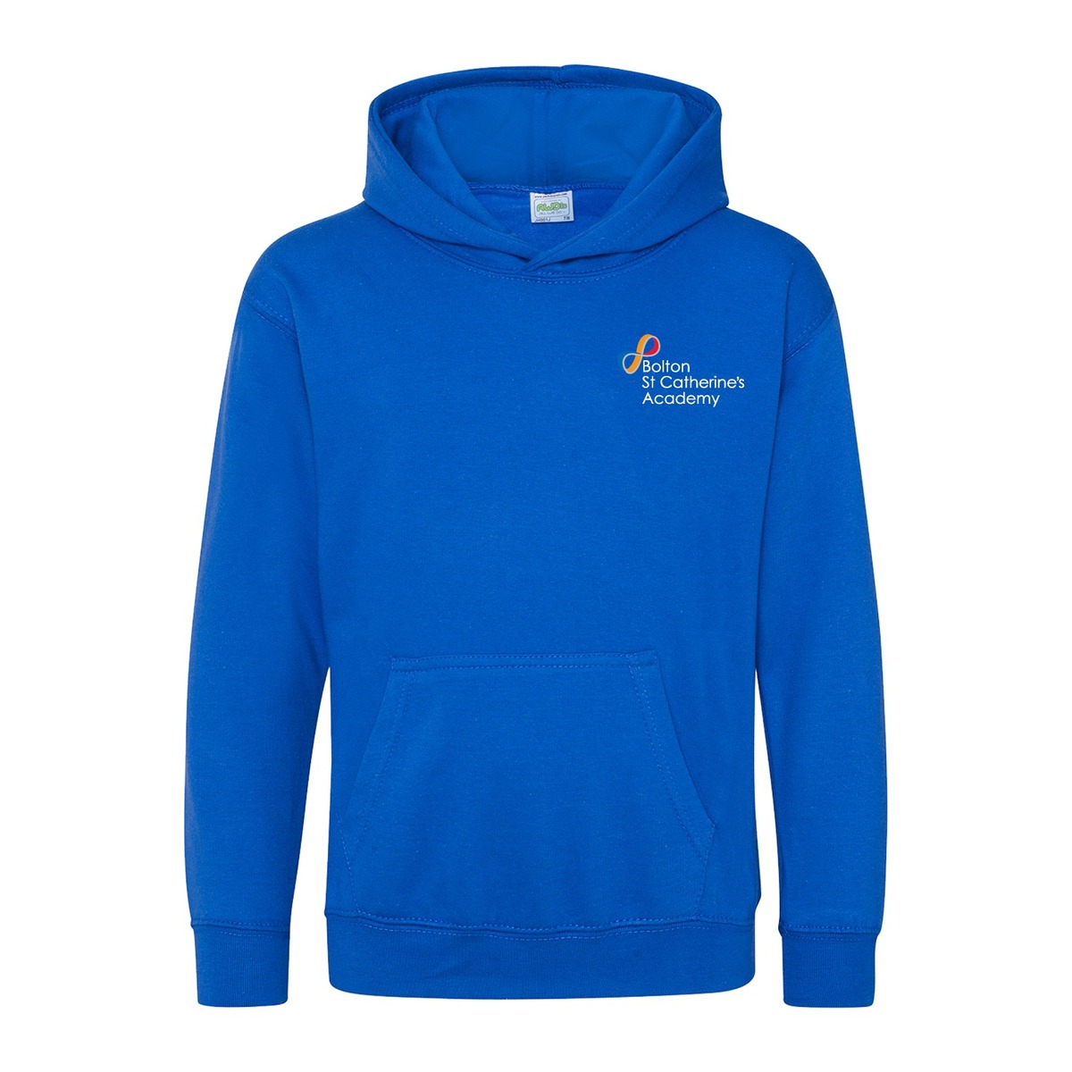 A relaxed-fit college hoodie made from durable 280gsm cotton-faced fabric for a soft, comfortable feel. Features include a double fabric hood, kangaroo pouch pocket, ribbed cuffs and hem, and twin needle stitching for added durability. See sizing information below; size up for a baggier fit.